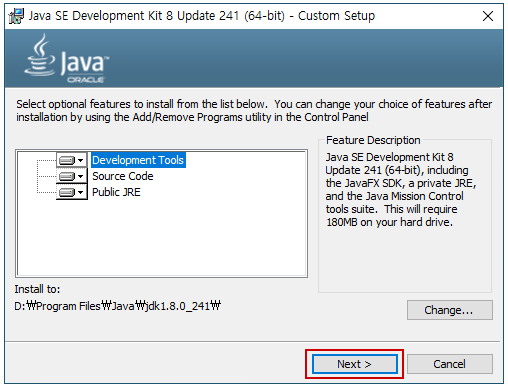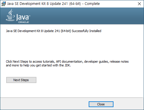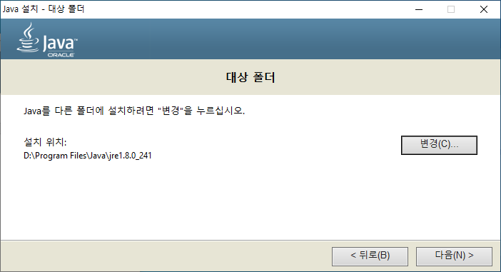 Oracle JDK 다운로드 (https://www.oracle.com/java/technologies/javase-jdk8-downloads.html)에서 OS에 맞는 설치 프로그램 다운로드 후 아래 과정에 따라 설치한다. 설치 프로그램 다운로드 시 Oracle 계정 로그인을 필요로 한다.