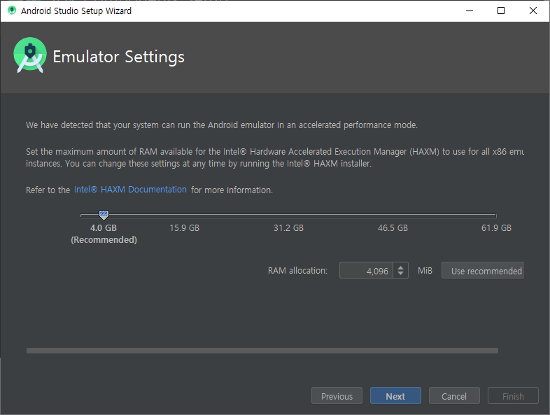 Emulator 사용에 대한 RAM 설정인데 Recommended로 해도 되고 필요에 따라 그 이상 올려도 된다.