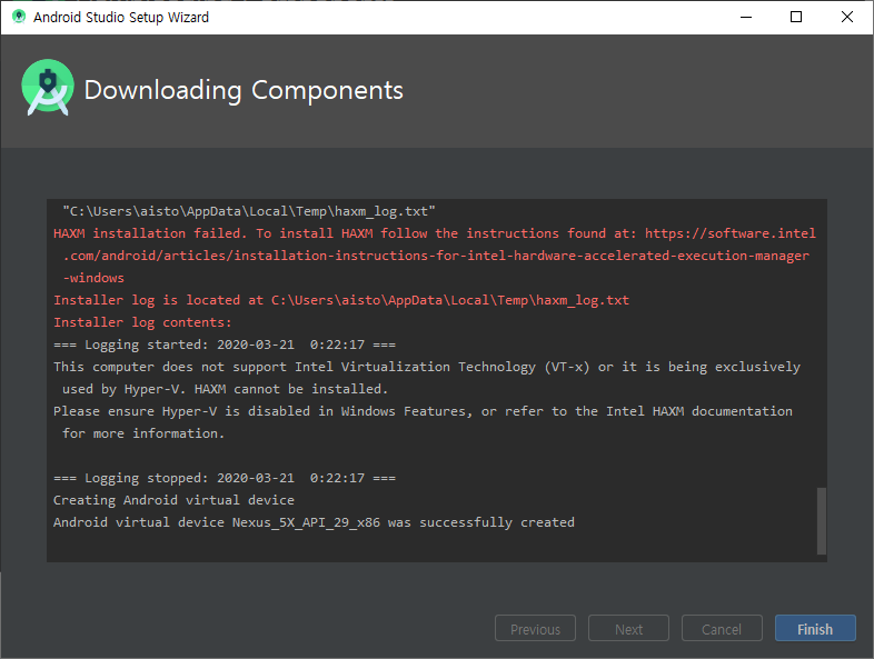 설치가 완료되었는데 오류가 발생했다. Window 기능 켜기/끄기에 Hyper-V 기능 꺼져있어서 생기는 문제이다.