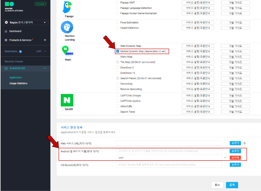 하단의 서비스 환경 등록에서 Android 앱 패키지 이름을 등록