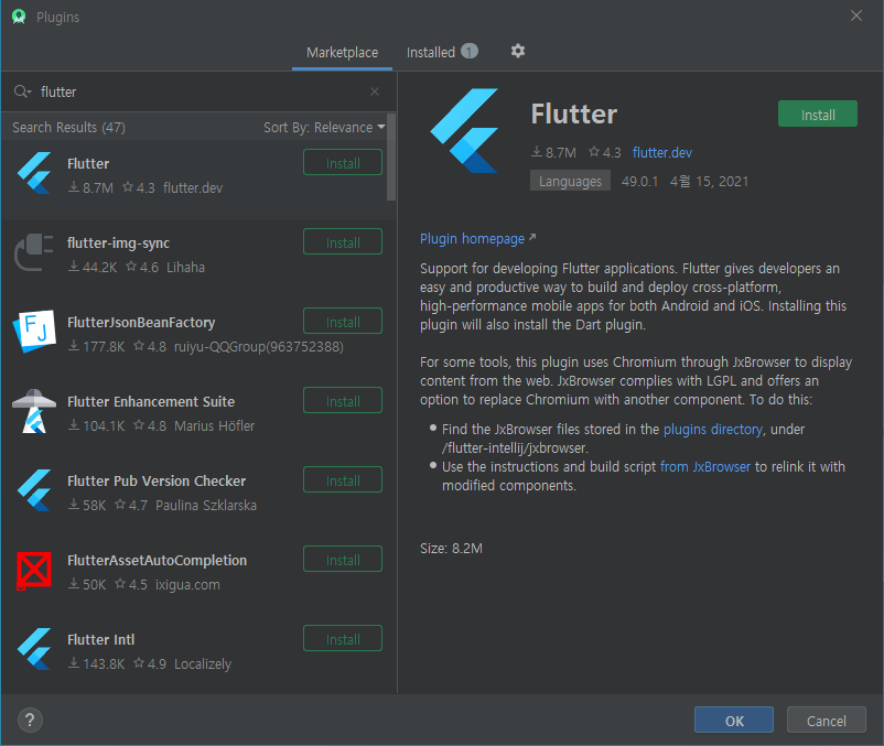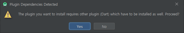 팝업으로 나오는 메시지 확인 후 Dart도 함께 설치한다.