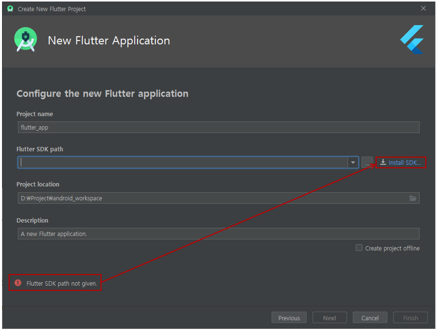 3.3. Flutter SDK path not given 메시지가 나오면 Install SDK를 통해 설치한다.