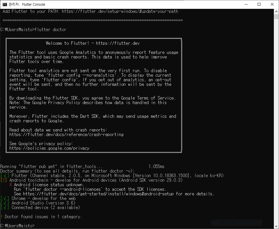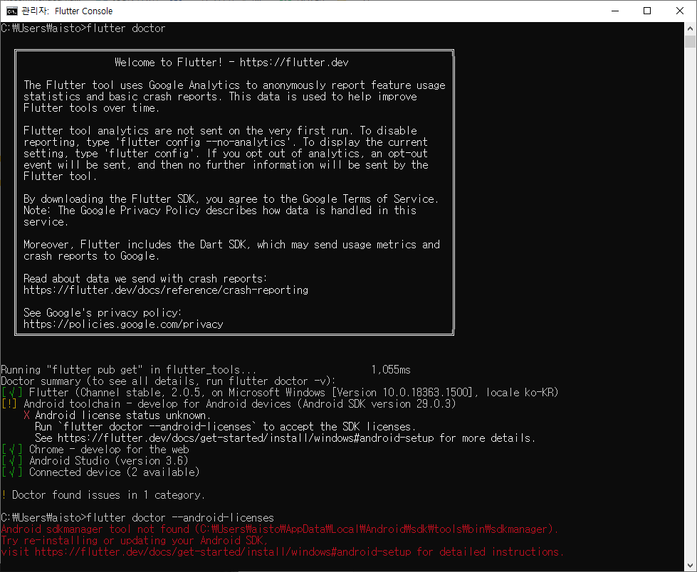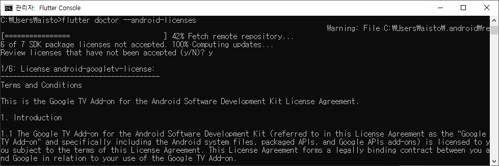 Flutter 커맨드 창에서 라이선스 관련 명령어를 실행한다.