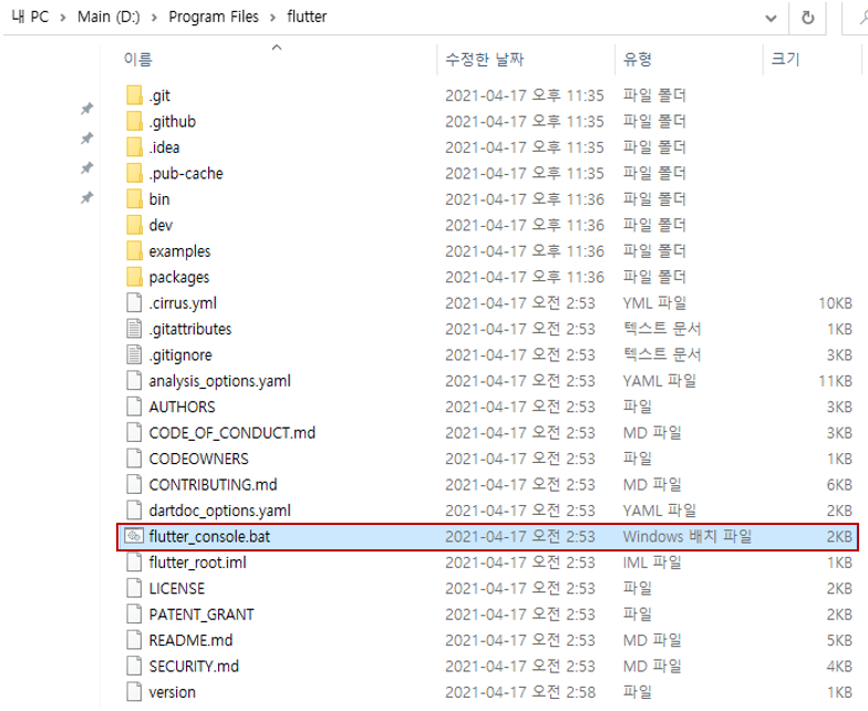 1.3. flutter 디렉토리 내에 flutter_console.bat 관리자 모드 실행