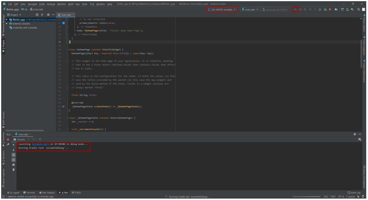 실행하자마자 나오는 샘플 코드를 그대로 실행해본다. 폰에 직접 연결해서 확인할 예정이기 때문에 체크하고 실행.