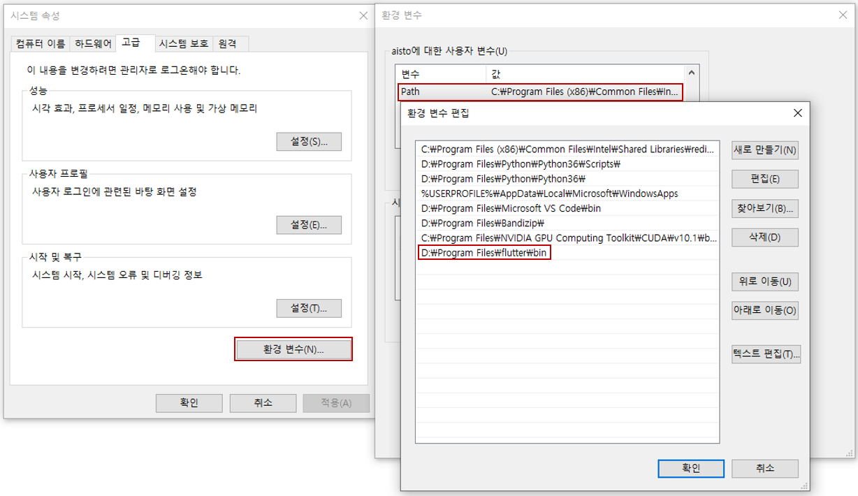 Flutter 디렉토리 내에 bin 디렉토리를 환경 변수로 추가한다.