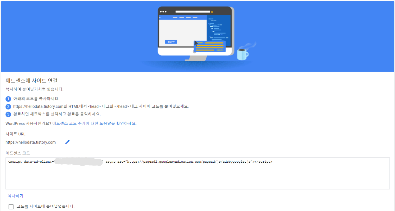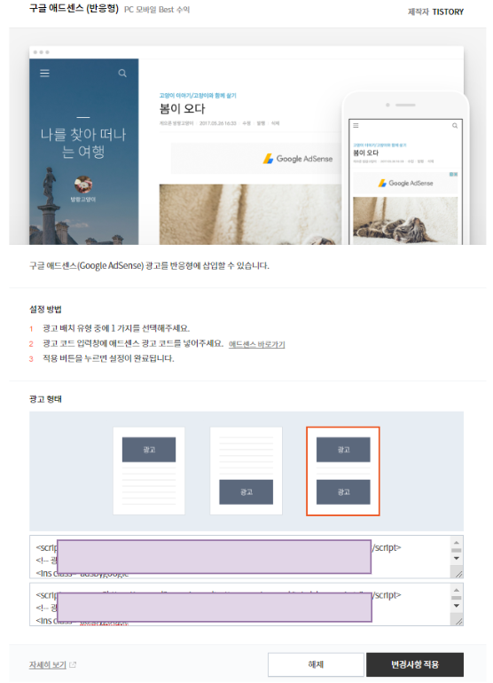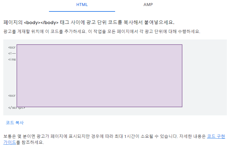 광고 형태를 선택하고 아래 코드창에 구글 애드센스에서 받은 코드를 붙여넣는다.