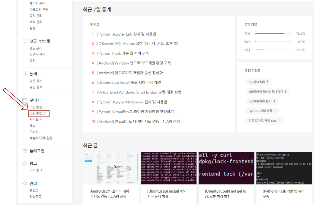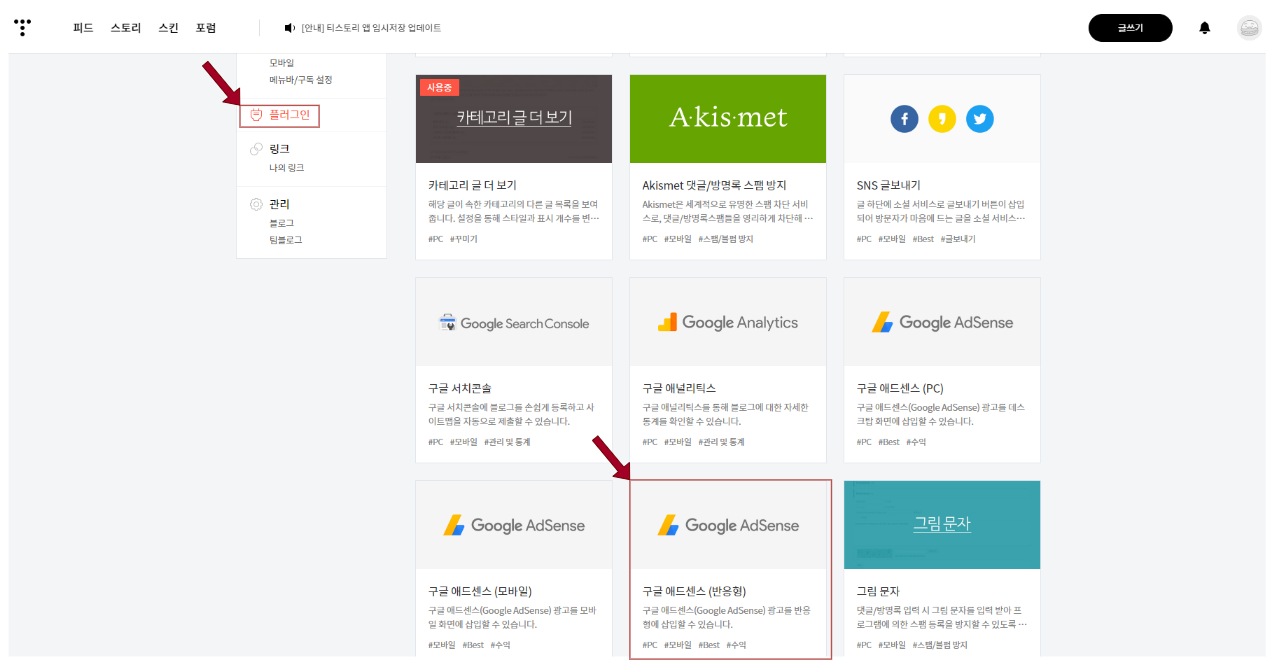 티스토리 블로그 관리화면 > 플러그인 > 구글 애드센스 (반응형)