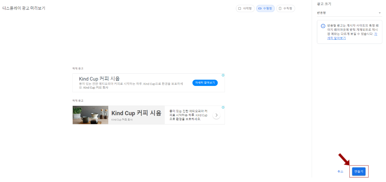 광고 크기 > 반응형 선택 > 왼쪽 상단에 광고명 임시로 작성 > 만들기