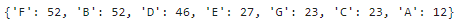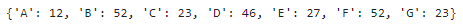 {'A': 12, 'B': 52, 'C': 23, 'D': 46, 'E': 27, 'F': 52, 'G': 23}