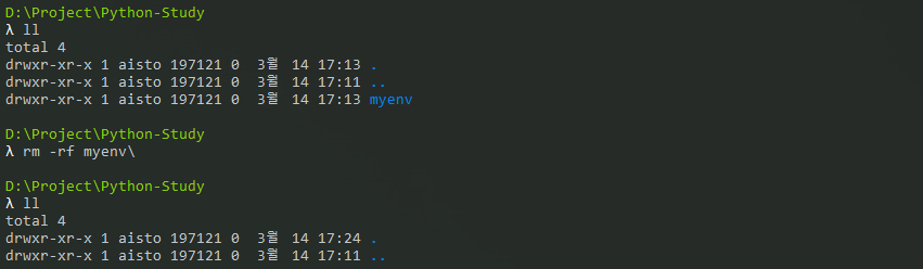 myenv 디렉토리를 그냥 지우면 가상환경이 삭제된다.