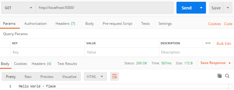 웹 서버 기능으로 심플한 기능 두 가지를 구성했다. /으로 요청하면 "Hello World - Flask"라는 문구를 출력하도록 하는 것과 /info로 요청하면 IP주소와 Host명을 응답하도록 했다. 어떤 호스트에서도 접근이 가능하도록 app.run에 host를 0.0.0.0으로 설정했고 port는 5000으로 지정했다. debug=True는 debug 모드를 킨 것으로 코드가 수정되면 flask 서버가 다시 시작된다.