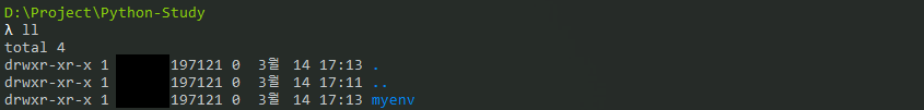 구성이 완료되면 디렉토리에 가상환경이름으로 폴더가 생성된다. myenv로 생성했기 때문에 myenv로 생성되어 있다.