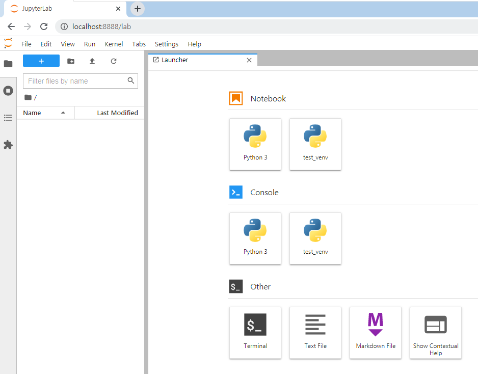 Notebook과 Lab의 화면을 비교하면 Notebook의 경우 ipynb 파일 리스트가 메인 화면에 출력되고 File, Running, Clusters 등의 메뉴가 상단에 있다. Lab의 경우에 해당 기능은 모두 왼쪽 탭 메뉴로 구성되어있고 실행 시 Python이나 Console, Terminal 등을 구동할 수 있는 Launcher 화면이 바로 나온다.