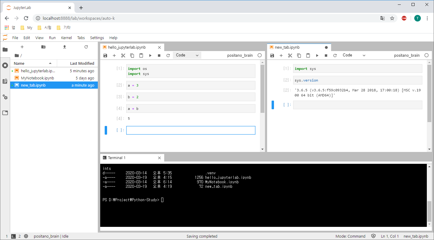 Editor 영역은 탭을 클릭하고 드래그하면 아래와 같이 화면 분할이 가능하며 Notebook 뿐만 아니라 일반 스크립트 편집, Terminal도 분할 창에 열 수 있어서 코드를 개발하고 테스트하는데 편리하다.