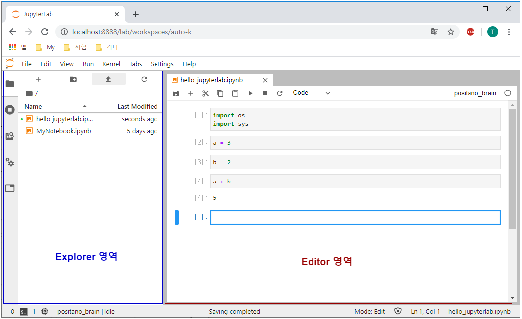 위와 같이 노트북 내에서 변수에 값을 대입하고 변수명을 실행해보면 값이 바로 보인다. Cell 앞에 출력된 [1], [5] 등의 숫자는 Cell의 실행 순서이다. 빨간색 부분의 [5]는 Notebook에서 다섯번째 실행된 Cell을 의미한다. Cell 단위 코드가 많아지면 앞에 순서를 통해서 실행된 순서를 참고하면 된다.