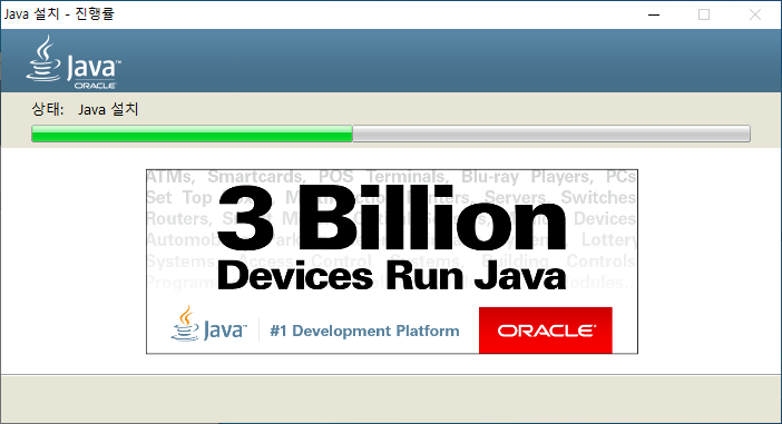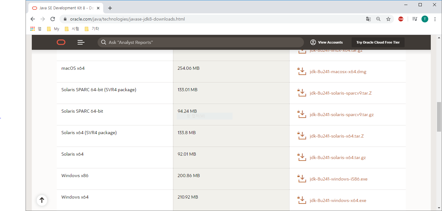 Oracle JDK 다운로드 (https://www.oracle.com/java/technologies/javase-jdk8-downloads.html)에서 OS에 맞는 설치 프로그램 다운로드 후 아래 과정에 따라 설치한다. 설치 프로그램 다운로드 시 Oracle 계정 로그인을 필요로 한다.