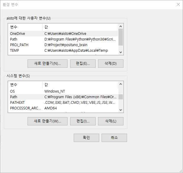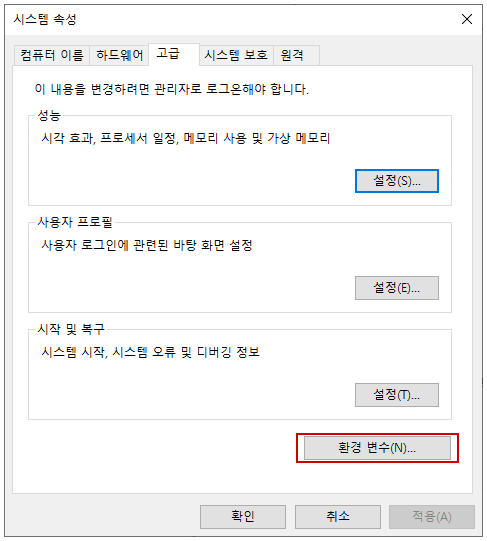 제어판 > 환경 변수 검색 > 시스템 환경 변수 편집